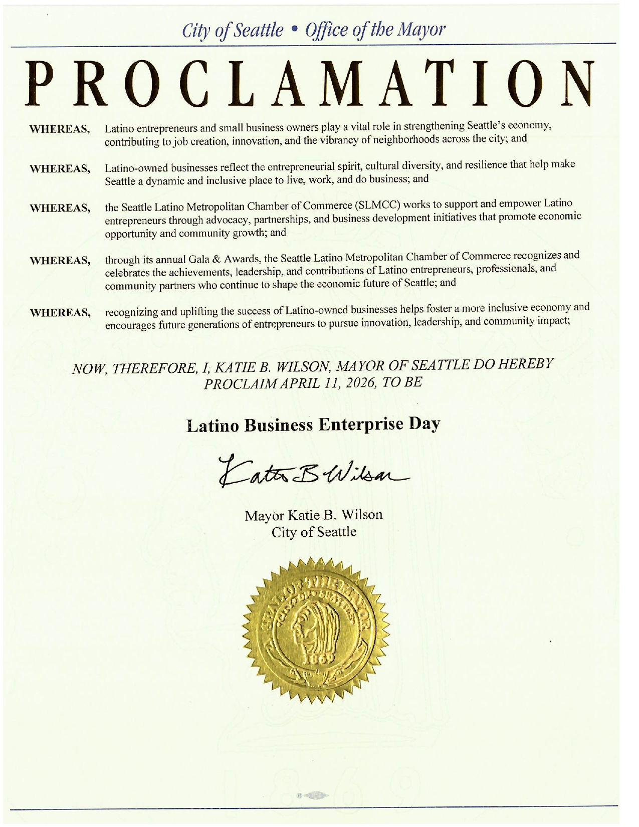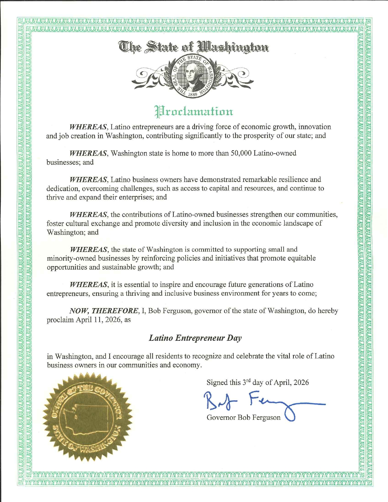 On April 11, 2026, we proudly received official proclamations from both the City of Seattle and the State of Washington, recognizing the vital contributions of Latino entrepreneurs to economic growth, innovation, and community development.